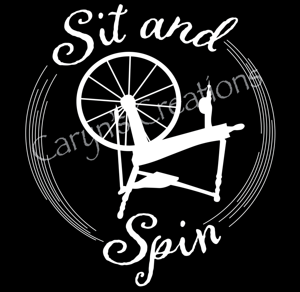 Photo description: “Sit and Spin” words in old script with the silhouette of a traditional spinning wheel and radial lines representing the action of spinning (watermark says “Caryn’s Creations” and is not present on purchased work)