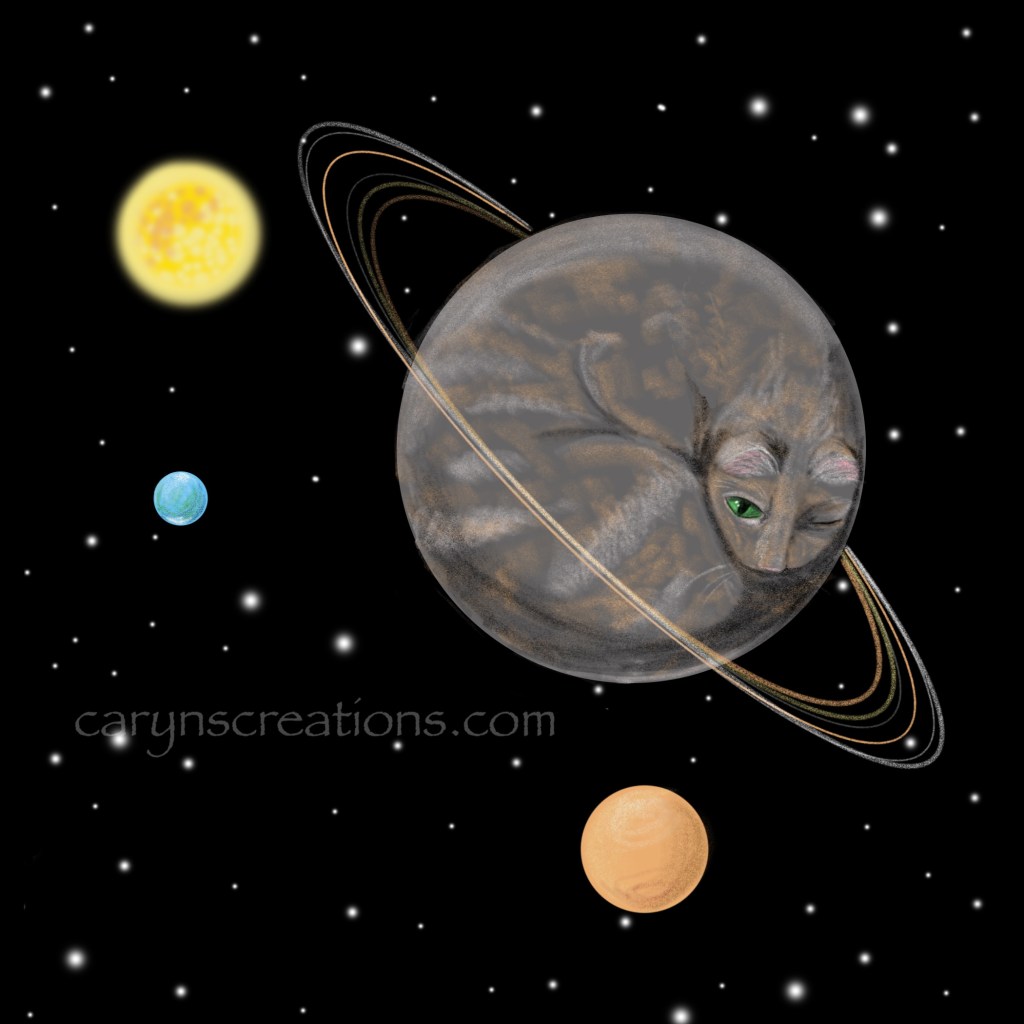 Last week’s drawing prompt was “cat”. Oh my. A photo search on my phone alone yielded 1,009 photos. So very many possibilities, and work and home life were hoppin’ so I decided to see if I could combine prompts again. This week’s prompt: “planet”. Hmm. Cat planet. Alrighty then. That does narrow the possibility matrix, but in very strange ways. My first idea was a cat playing with a planet, maybe even gripping a hapless Earth in its celestial jaws. But wait, what if the cat WAS the planet, and the drawing captures the moment that an orbiting moon catches the sleeping interstellar feline’s attention?