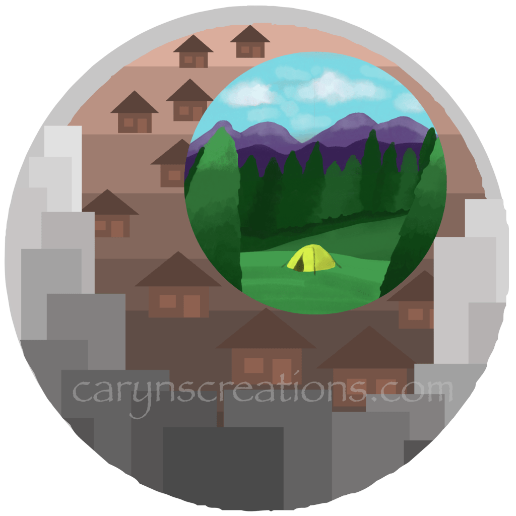 This week’s prompt is “remote”. I worked with masks in Adobe Fresco for this concept. I was so excited that masks are supported in the app! My concept is being remote from the crowds of cities and suburbia. So my city circle and ‘burbs circle are single hue, simple shapes, done with vector layers and masks. But the little tent out in the mountains uses vibrant color and I made use of the water color brushes in Fresco (and lots, and lots of layers). I did merge the layers before I applied the circle mask. Hmm. I didn’t incorporate the actual word in this week’s prompt. Maybe that is a challenge for another week.